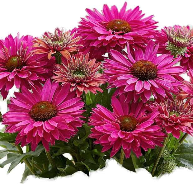 Not everything in this series is double but the newest ones experiment with this noval form for coneflowers. Their colors and unique petal shapes, when doubled in the rings, creates the varieties' different personalities. The plants themselves are dwarf and bushy in nature, bred for good branching, multiple flowers, and robust crowns.