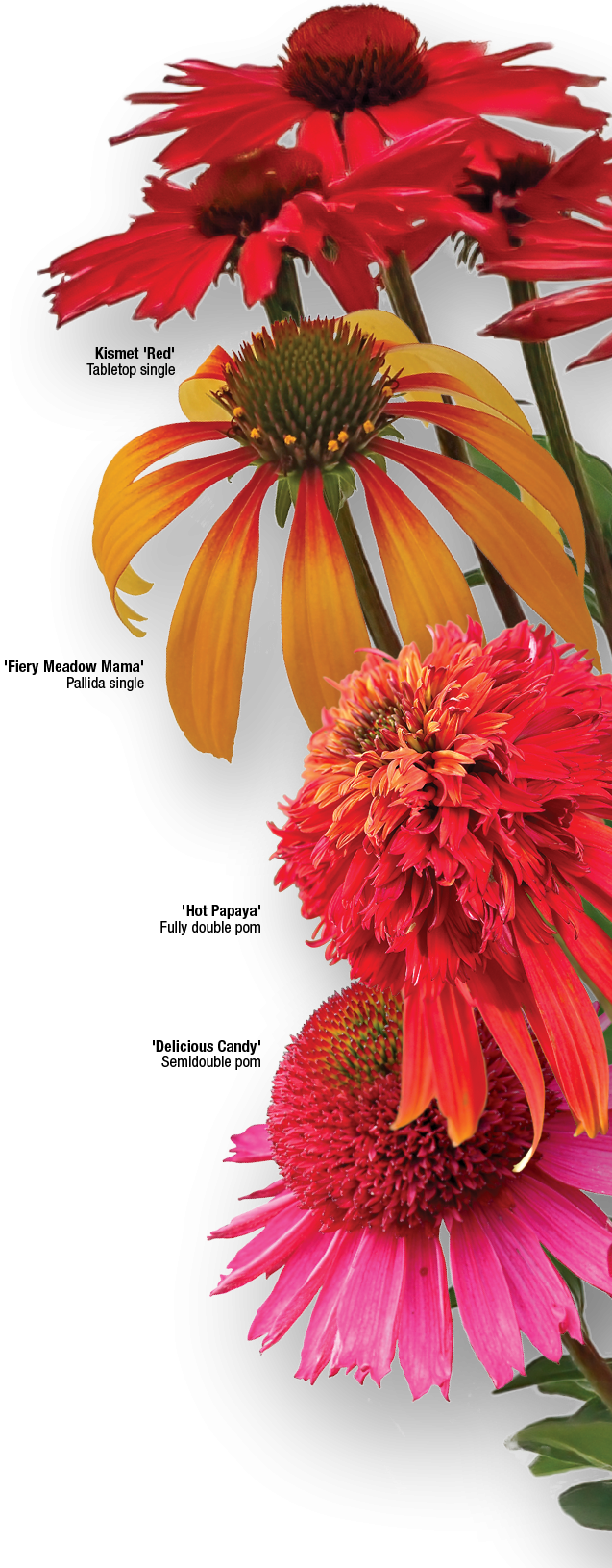 Not everything in this series is double but the newest ones experiment with this noval form for coneflowers. Their colors and unique petal shapes, when doubled in the rings, creates the varieties' different personalities. The plants themselves are dwarf and bushy in nature, bred for good branching, multiple flowers, and robust crowns.